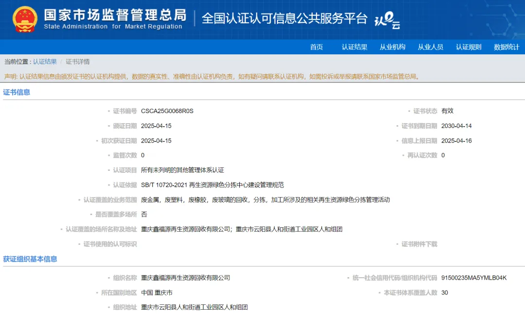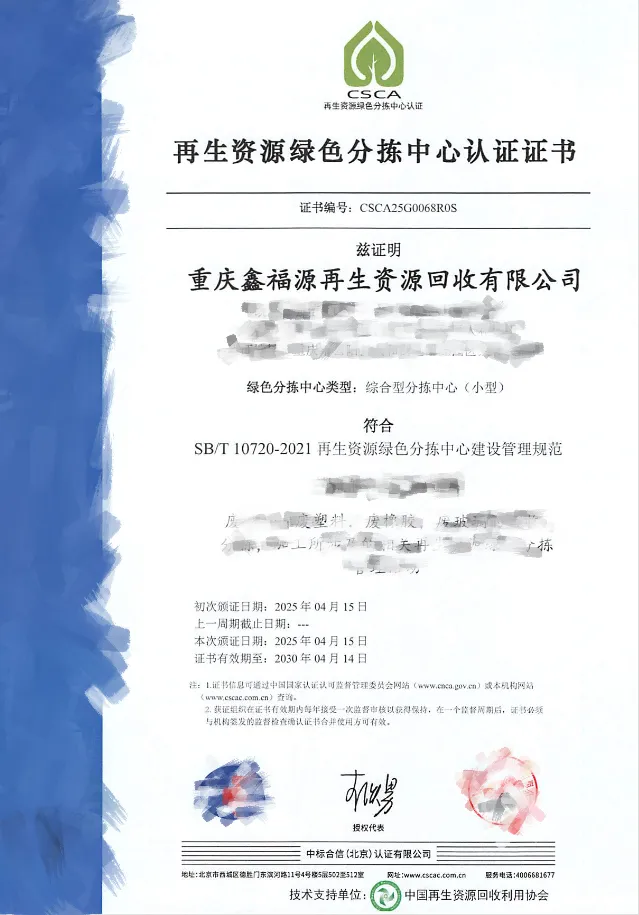 【068号】祝贺重庆鑫福源再生资源回收有限公司顺利通过再生资源绿色分拣中心认证