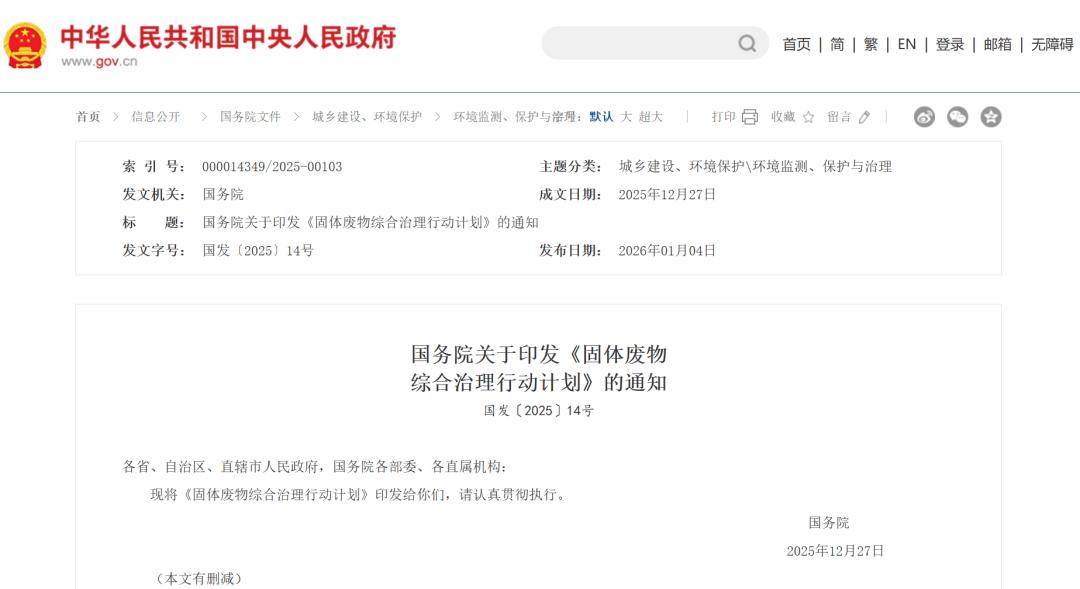 国务院关于印发《固体废物综合治理行动计划》的通知国发〔2025〕14号
