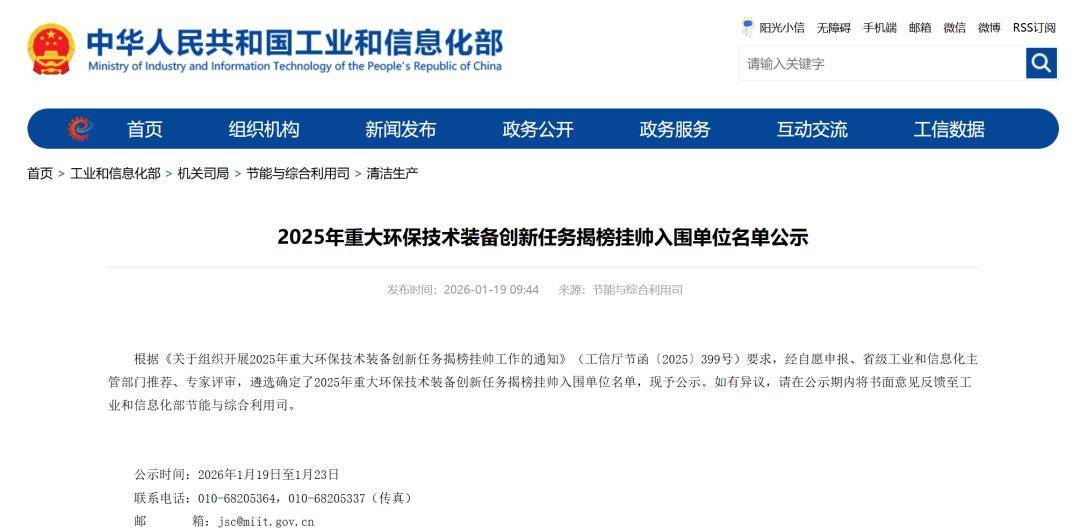 根据《关于组织开展2025年重大环保技术装备创新任务揭榜挂帅工作的通知》(工信厅节函〔2025〕399号)要求,经自愿申报、省级工业和信息化主管部门推荐、专家评审,遴选确定了2025年重大环保技术装备创新任务揭榜挂帅入围单位名单,现予公示。如有异议,请在公示期内将书面意见反馈至工业和信息化部节能与综合利用司。