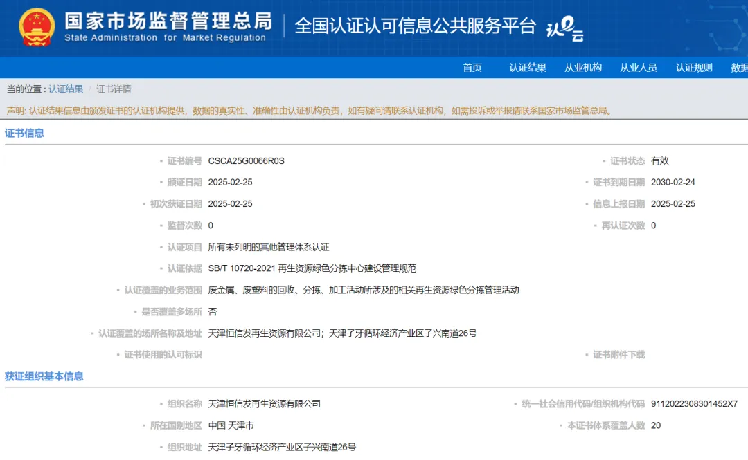 国家市场监督管理总局查询结果:天津恒信发再生资源有限公司