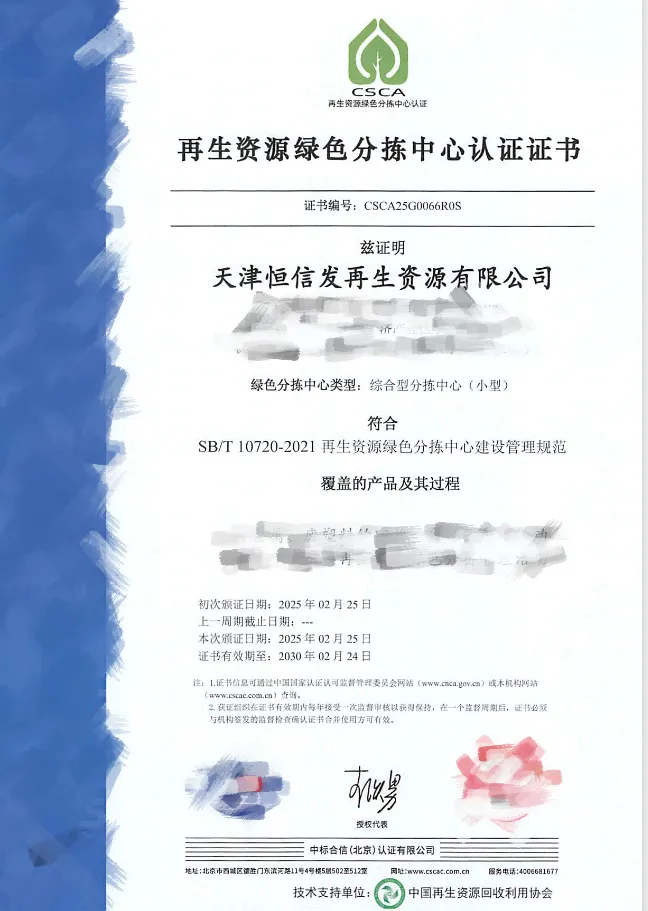 【066号】祝贺天津恒信发再生资源有限公司顺利通过再生资源绿色分拣中心认证