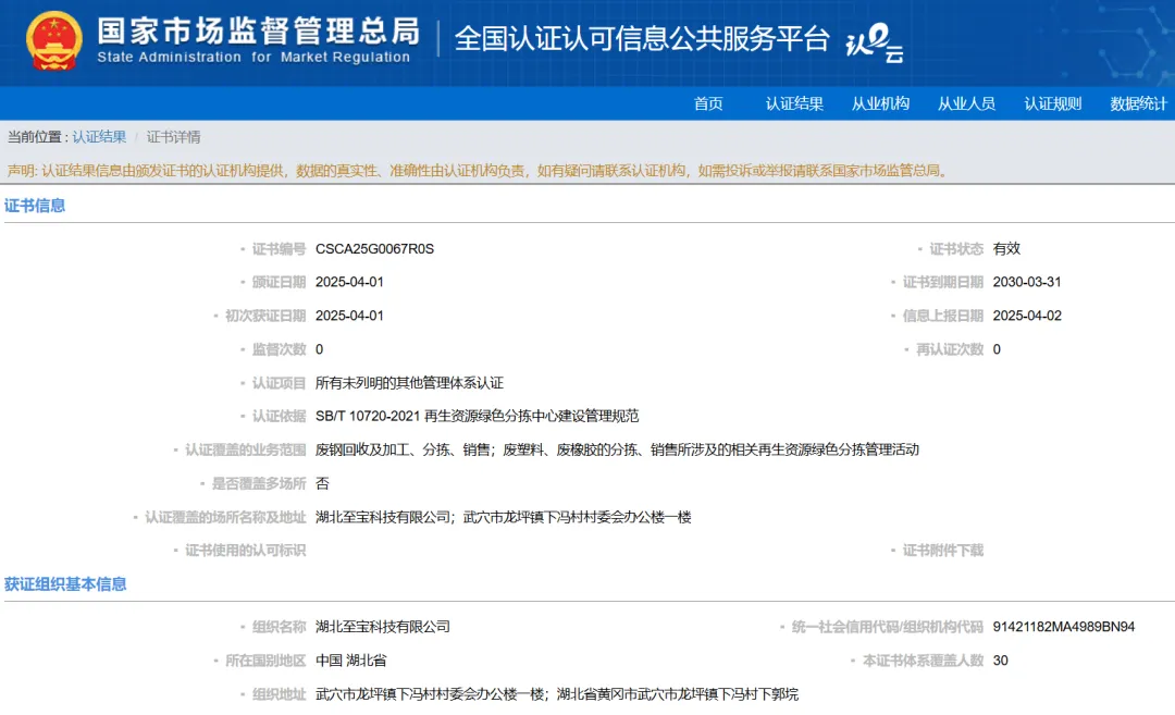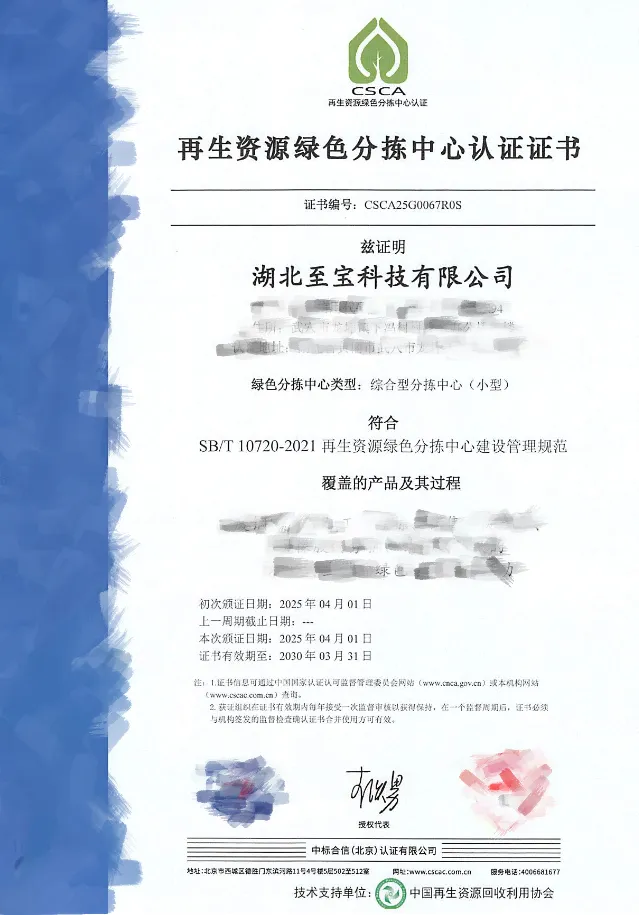 【067号】祝贺湖北至宝科技有限公司顺利通过再生资源绿色分拣中心认证
